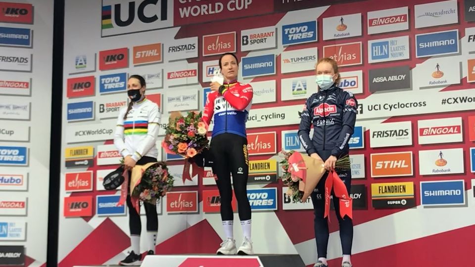 Winnaar bij de vrouwen, Marianne Vos, neemt haar mondkapje af, om het Wilhelmus mee te zingen.