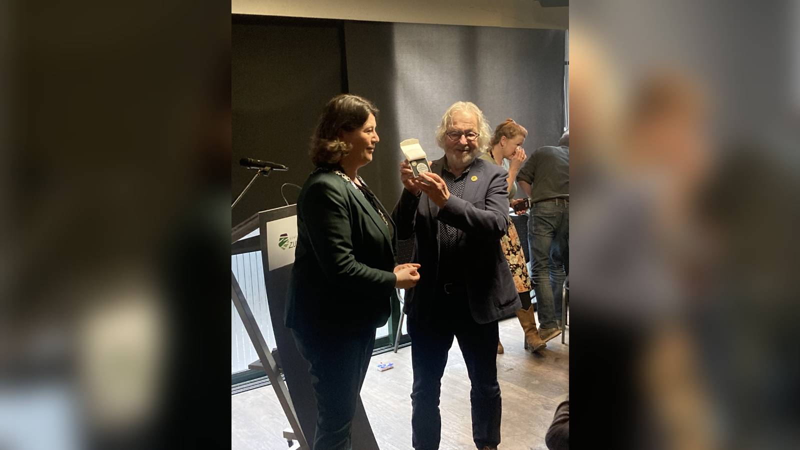 Johan Brosens ontvangt de oorkonde en zilveren legpenning van burgemeester Joyce Vermue. (Foto: Charles van Campenhout)
