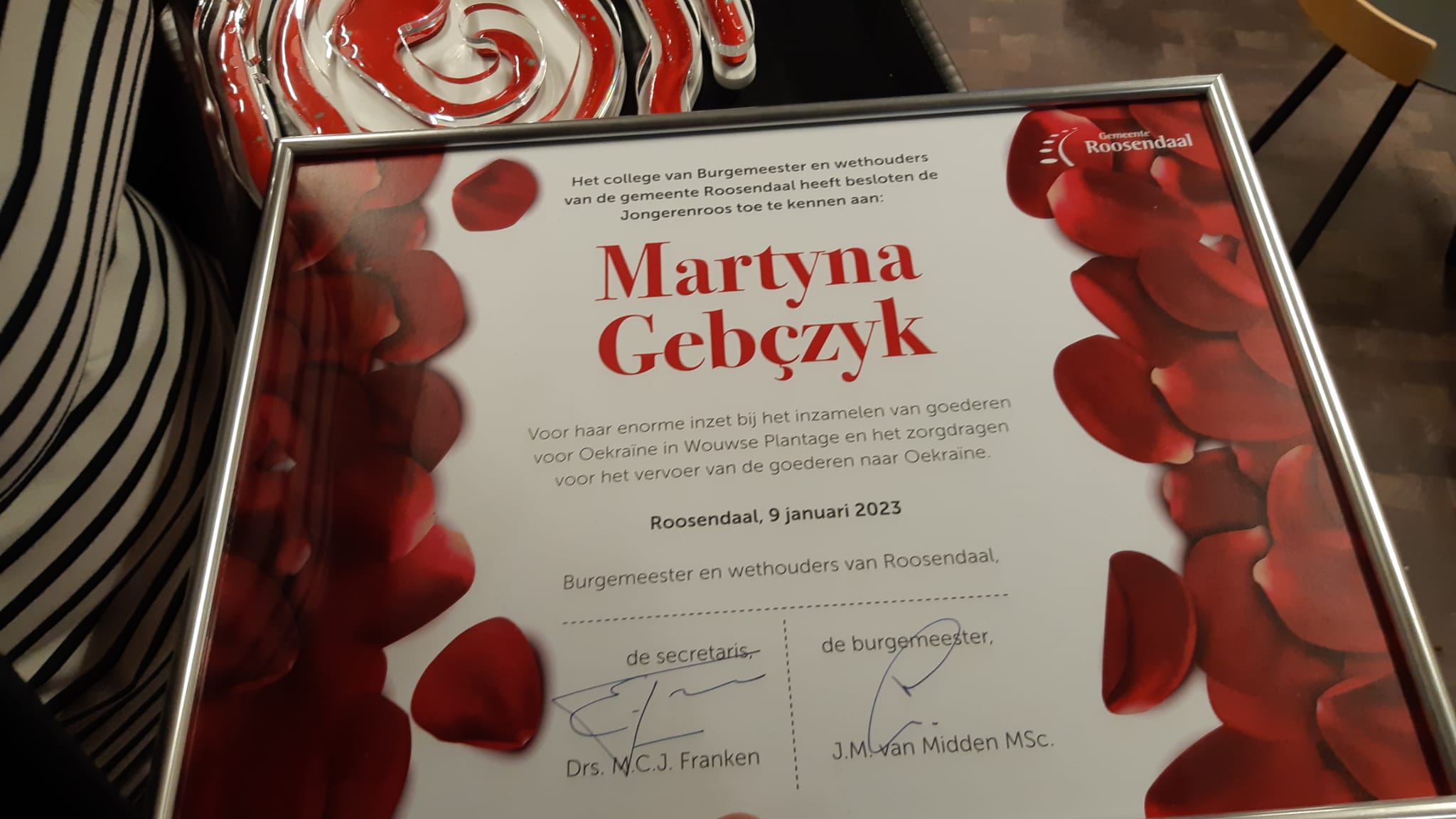 Martyna Gebçzyk, Luc de Waal en Kimberly den Ouden hebben de Jongerenroos gekregen. Luc was niet aanwezig, dus nam zijn zus de Jongerenroos in ontvangst.