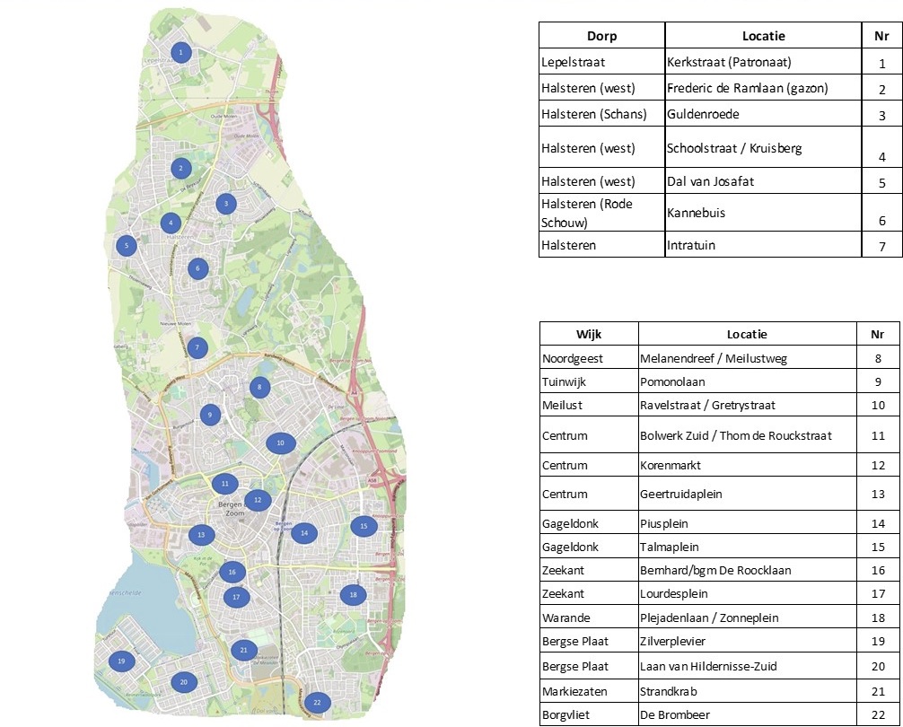 In Lepelstraat is de inleverlocatie in de Kerkstraat te vinden. Halsteren heeft zes locaties, verspreid over de regio’s Schans, West, Rode Schouw en de Intratuin. Bergen op Zoom telt vijftien inleverpunten. In de wijken Noordgeest, Tuinwijk, Meilust, het Centrum, Gageldonk, Zeekant, Warande, Bergse Plaat, Markiezaten en Borgvliet, staat een verzamelpunt voor de bomen.