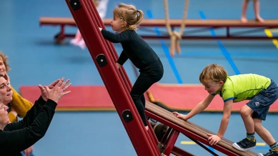 Tijdens de middag staan er verschillende parcoursen in de gymzaal waar de kinderen moeten klauteren en klimmen. “Juf Demi staat klaar met een uitdagend parcours en daagt iedereen uit om grenzen te verleggen”, zegt Meike van Wezel van Symmachia. Maar het gaat ook vooral om het plezier. “Om de kinderen enthousiast te krijgen.”