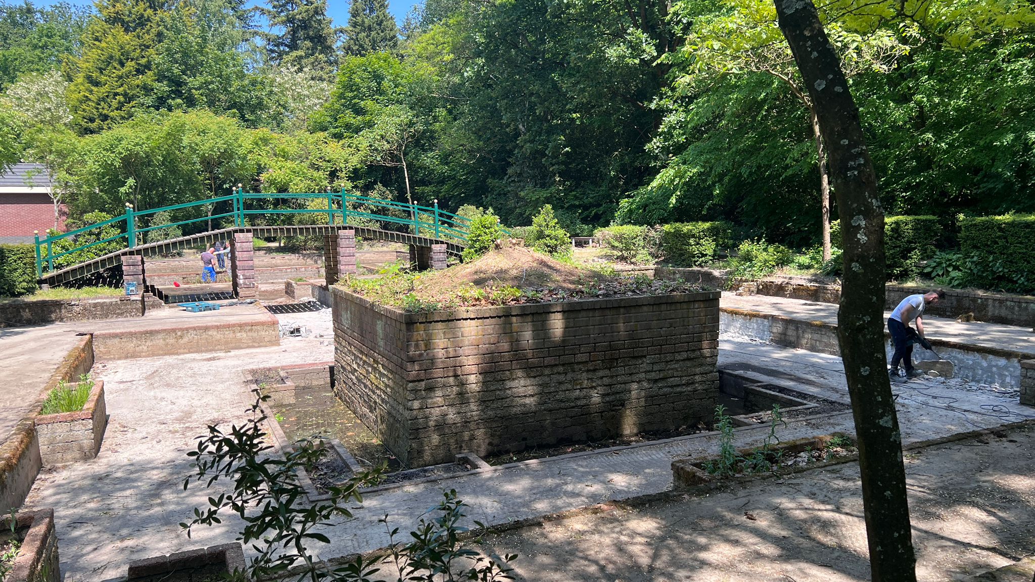 Onder toeziend oog van wethouder Jeffrey van Agtmaal wordt door de werklui de vijver schoongespoten met een hoge drukspuit. Het opknappen is een wens van de bewonersvereniging Ste. Marie en verschillende inwoners van Huijbergen. “De vijver wordt nu helemaal schoongemaakt. Daarna worden alle scheuren die erin zitten hersteld. Vervolgens wordt de vijver waterdichtgemaakt met behulp van een coating”, vertelt de wethouder.