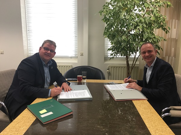 Wethouder Patrick van der Velden en Job van Zomeren ondertekenen de koopovereenkomst