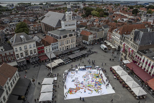 De publiekstrekker was het grote kunstwerk van Iwaz: het schilderen van één groot kleurrijk Europa © Ferry Jansen/ZuidWest Update