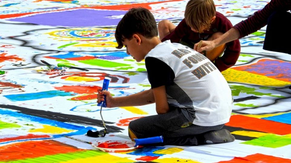 De publiekstrekker was het grote kunstwerk van Iwaz: het schilderen van één groot kleurrijk Europa © Ferry Jansen/ZuidWest Update