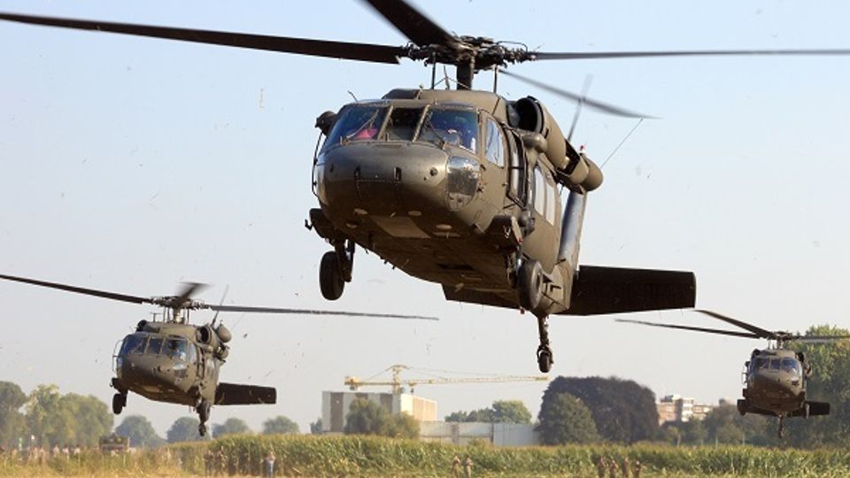 Laagvliegende helikopters tijdens oefening vliegbasis Woensdrecht
