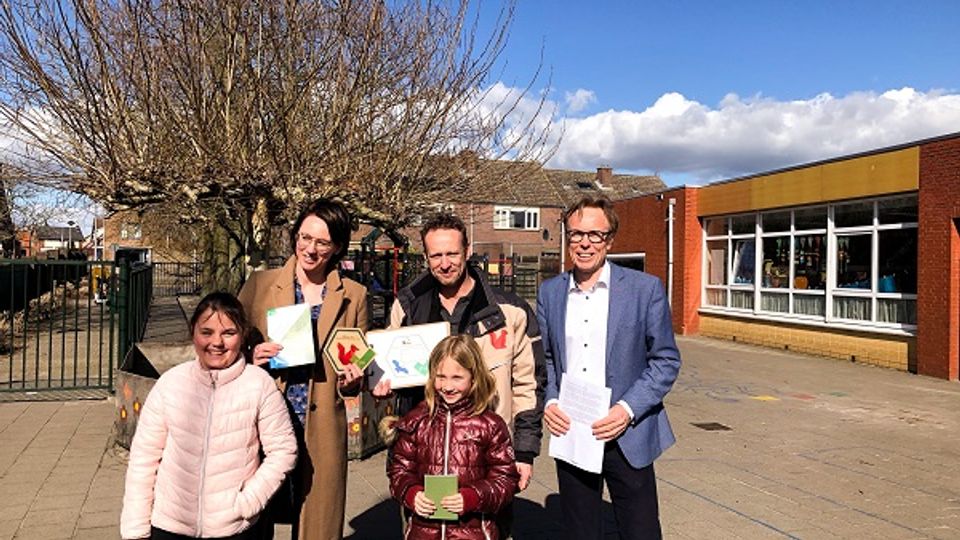 Maandag 18 maart kregen de leerlingen van basisschool de Meulenrakkers hun Natuur-podiumpaspoorten uitgereikt. Directrice Jannie Bouwens ontving de paspoorten en de plaquette ‘Natuur & Duurzaamheidseducatie’ uit handen van wethouder Lars van Beek en Natuurpodium directeur Robert Deliën.