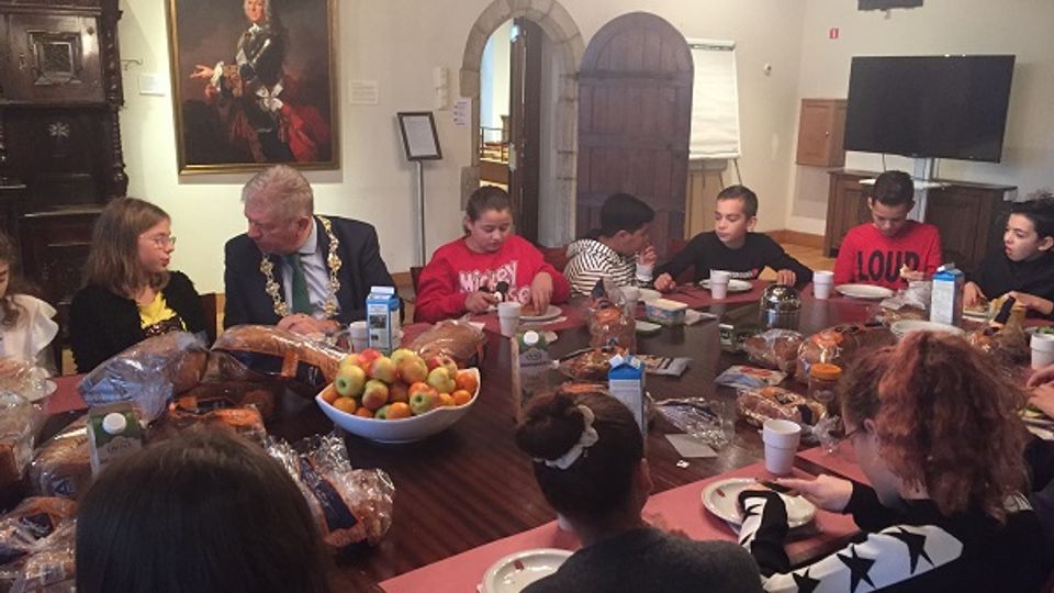 Het is de Week van het Nationaal Schoolontbijt. Daarom mochten leerlingen van basisschool De Kreek in Bergen op Zoom woensdagochtend ontbijten met burgemeester Frank Petter in het Oude Stadhuis.