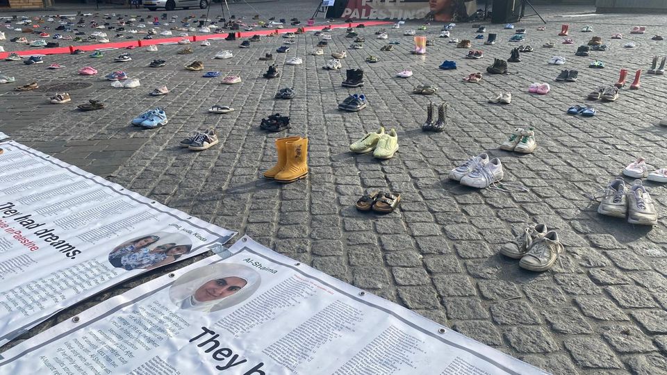 Rondom een informatiekraam stonden tientallen paren kinderschoenen, elk symbool voor een naam. “Op het nieuws worden Palestijnse kinderen vaak alleen als aantallen genoemd, niet bij naam. Wij willen laten zien dat het kinderen waren met dromen,” aldus Ahmed. “Veel mensen hebben hier tranen gelaten, en dat snap ik. Dit zijn kinderen die hun leven hebben verloren.”