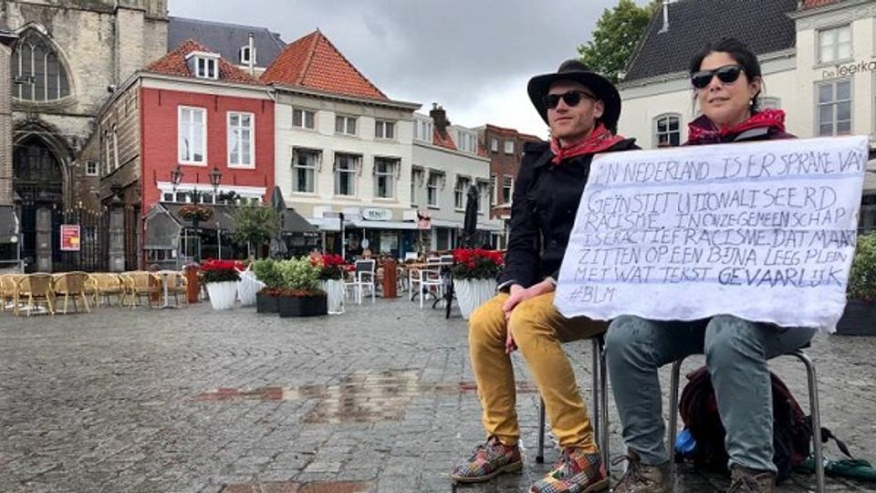 Een protestbord en twee stoeltjes. Meer hebben de twee demonstranten op de Grote Markt in Bergen op Zoom maandag niet nodig. In de stromende regen voeren ze stipt tussen twaalf en half één actie tegen racisme. De twee, een man en een vrouw afkomstig uit de regio, willen ‘anoniem’ blijven. Sinds afgelopen vrijdag houden de activisten een dagelijks stil protest en ze zijn vast van plan om het nog heel lang vol te houden.