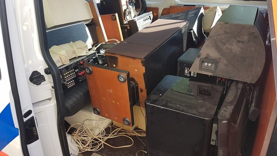 De man weigerde om de politie binnen te laten, dus werd de deur geforceerd. Binnen stonden behoorlijk wat geluidsboxen en versterkers.