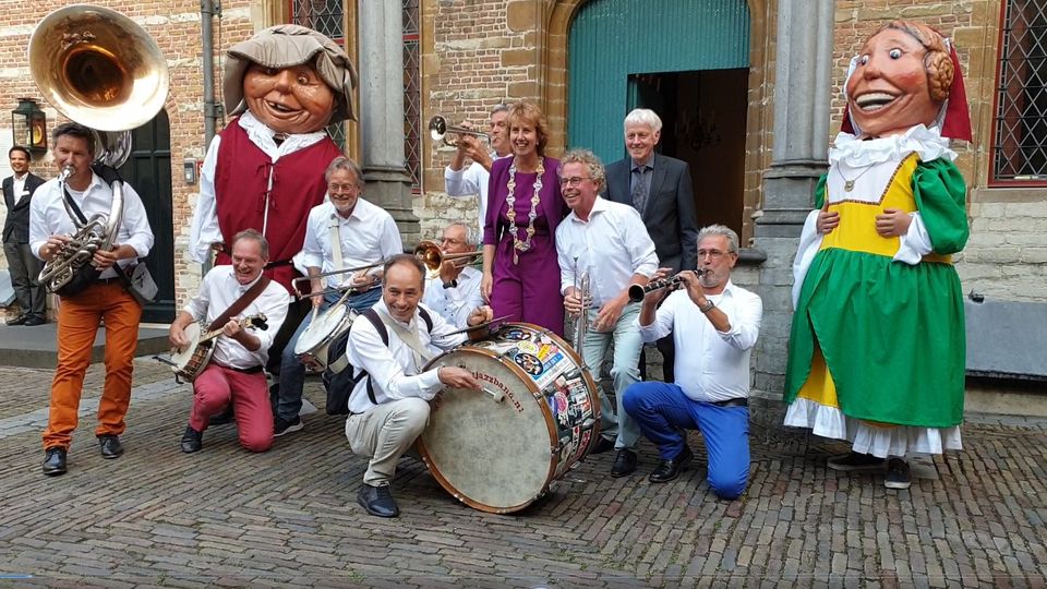 Burgemeester Margo Mulder en haar echtgenoot Paul, verwelkomd door een jazzband en twee Stadsreuzen.