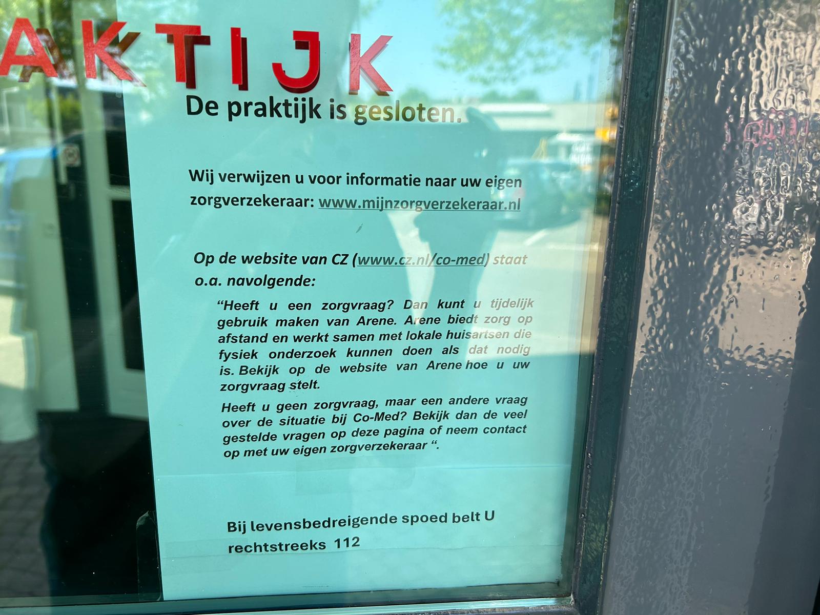 Marjolijn moest via een briefje dat geplakt zit op een ruit van de huisartsenpraktijk vernemen dat Co-Med gesloten is.