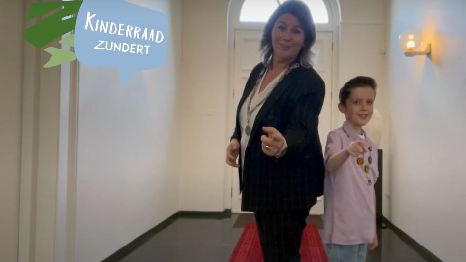 Burgemeester Joyce Vermue en kinderburgemeester Ties van Steen zoeken nieuwe leden voor de kinderraad (Beeld uit video gemeente Zundert)