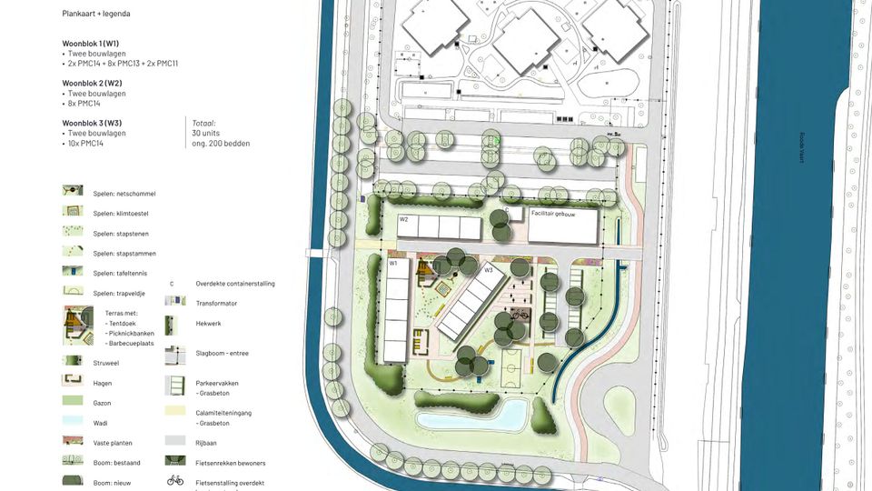 In kleur het ontwerp voor de nieuwe voorziening. De drie blokjes bovenin zijn de bestaande flats.