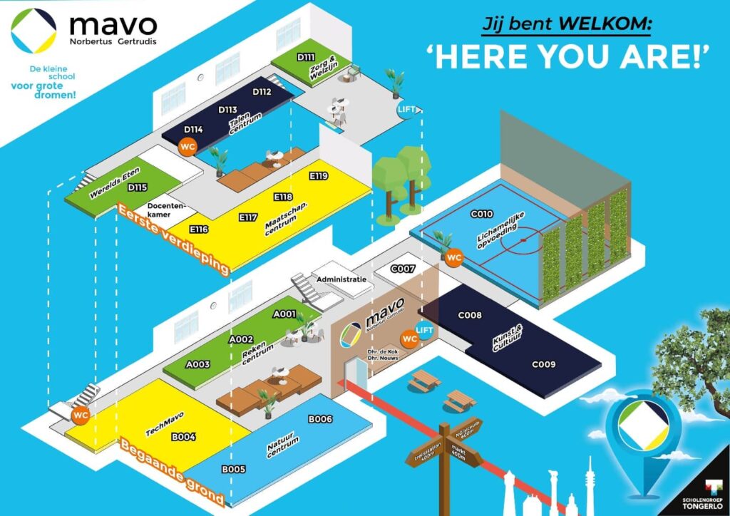 Gekleurde skytubes bewegen vrolijk door de wind, terwijl twee bouwvakkers druk bezig zijn om de fietsenstalling bij de gerenoveerde Norbertus Gertrudis Mavo uit te breiden. “Binnenin is het klaar om donderdag te starten met de lessen”, vertelt directrice Kiki Nieuwkerk. Geduldig staat een groep brugklassers voor de entree. Snel worden er nog mondkapjes uit rugzakken gegrist, voordat de leerlingen het vernieuwde gebouw instappen.
