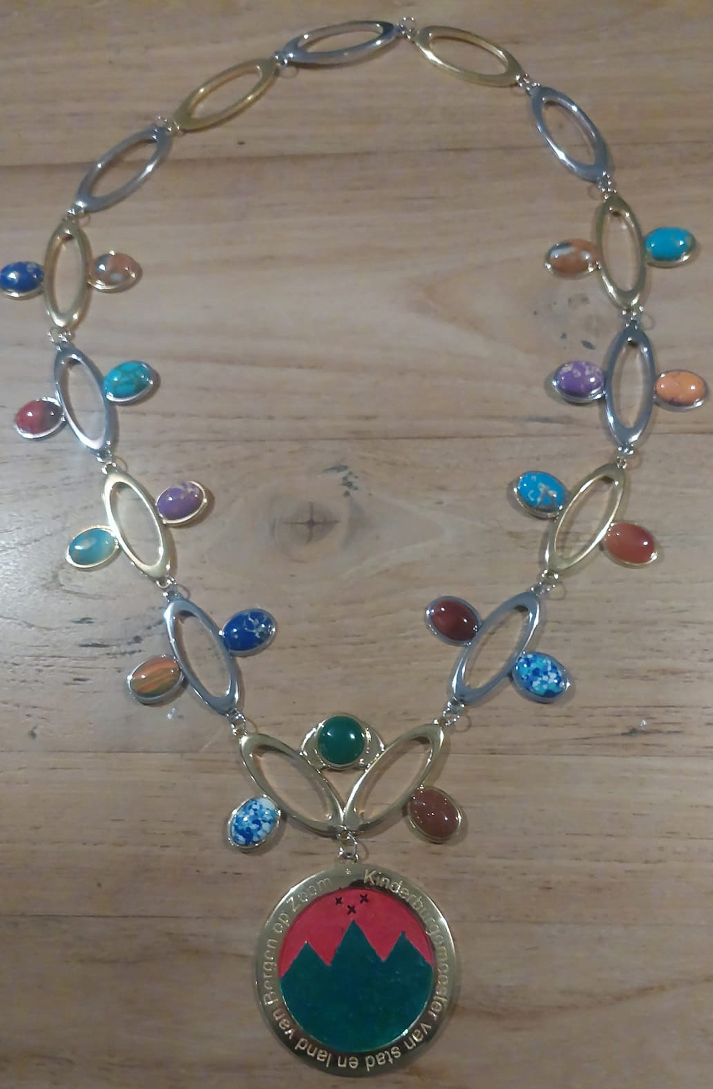 Ollie Warmoeskerken presenteert de kinderambtsketen van Bergen op Zoom, die hij heeft ontworpen.