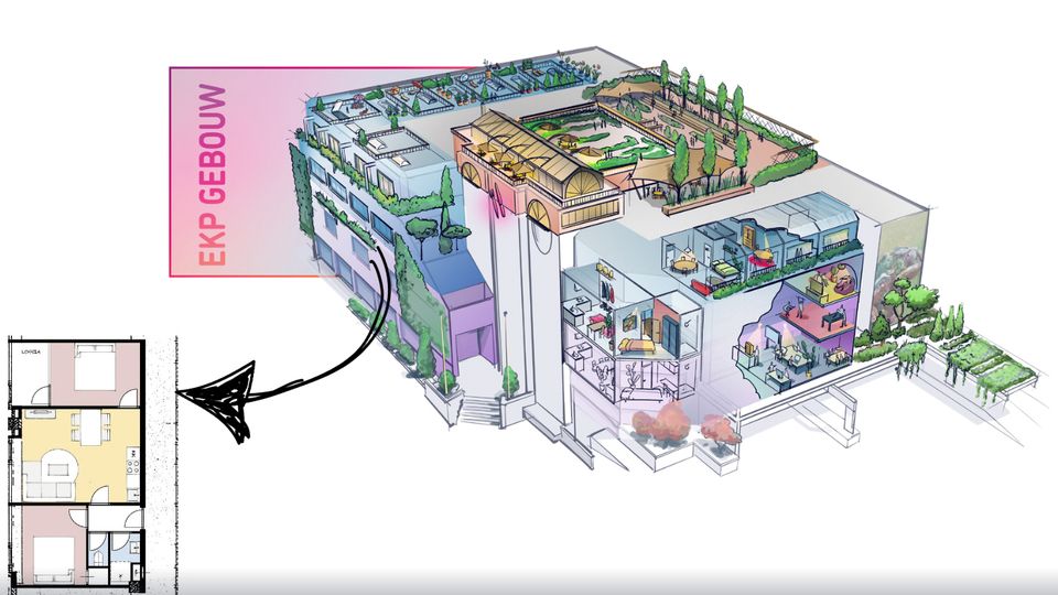 In het pand zijn tevens studio’s voorzien die woonruimte voor jongeren moeten bieden. De tweede en derde etage krijgen ‘woonconcepten in ringen’, waarvoor de gemeenschappelijke ruimte nog verder wordt uitgewerkt. “Van alles wat je nodig hebt om het leuk te hebben en goed te wonen in het EKP en in Roosendaal.”