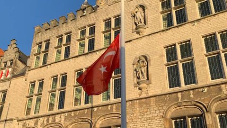 Uit medeleven met de nabestaanden van de slachtoffers van de aanslag in Istanboel hangt de Turkse vlag halfstok bij het stadhuis van Bergen op Zoom. (Foto: Facebook / Gemeente Bergen op Zoom)