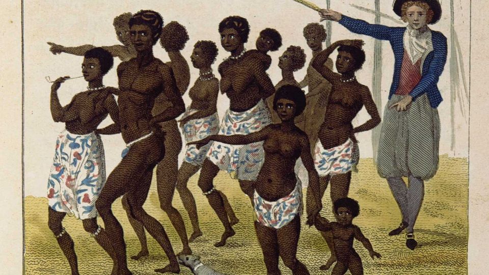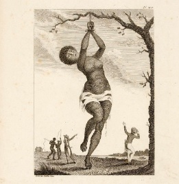 Slavenhandel in Suriname, eind 18e eeuw. (Illustratie uit reisverslag k John Stedman)