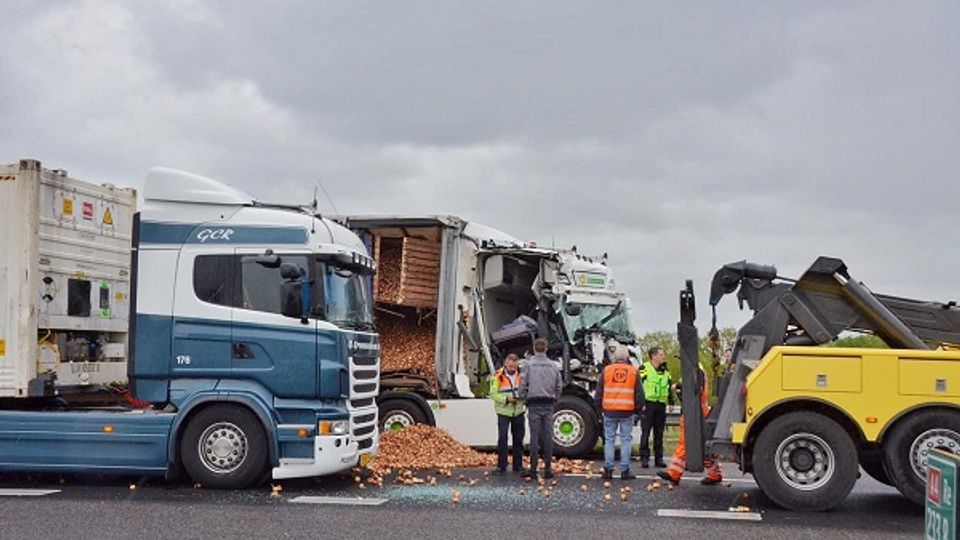 Op de A4 bij Bergen op Zoom is donderdagmiddag een ongeluk gebeurd met twee vrachtwagens en een personenauto. Een van de vrachtwagens was volgeladen met uien. Die lading lag deels op de snelweg.