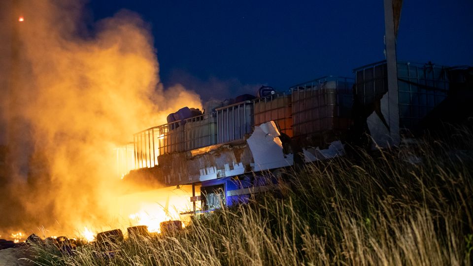 In de trailer zijn zo’n 150 vaten en jerrycans aangetroffen. Waarschijnlijk gaat het om synthetisch drugsafval. Rondom de trailer hing een anijsgeur. Hoeveel van de vaten gevuld waren is niet bekend. Door de brand zijn meerdere vaten gaan lekken.