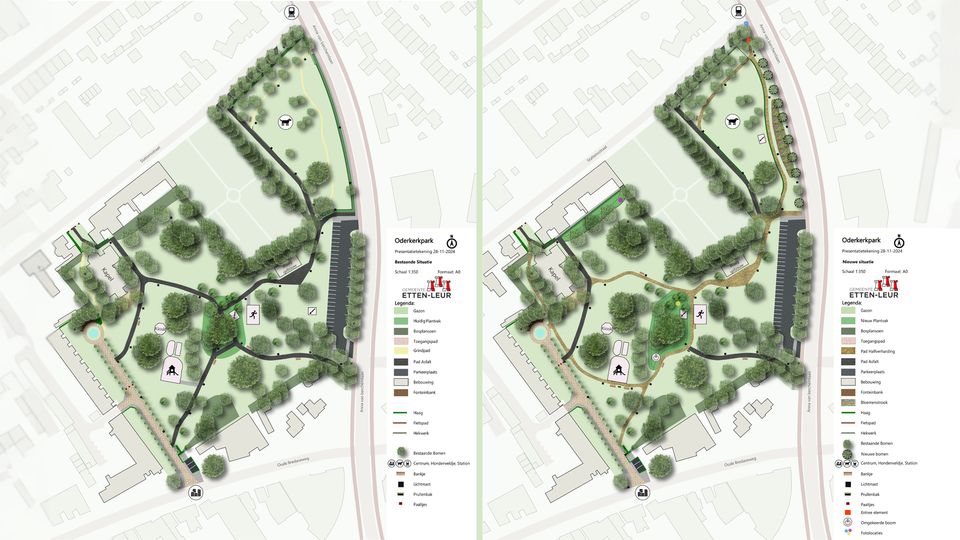 De huidige situatie van het Oderkerkpark (links) en het voorlopige ontwerp (rechts). (Beeld: Gemeente Etten-Leur)