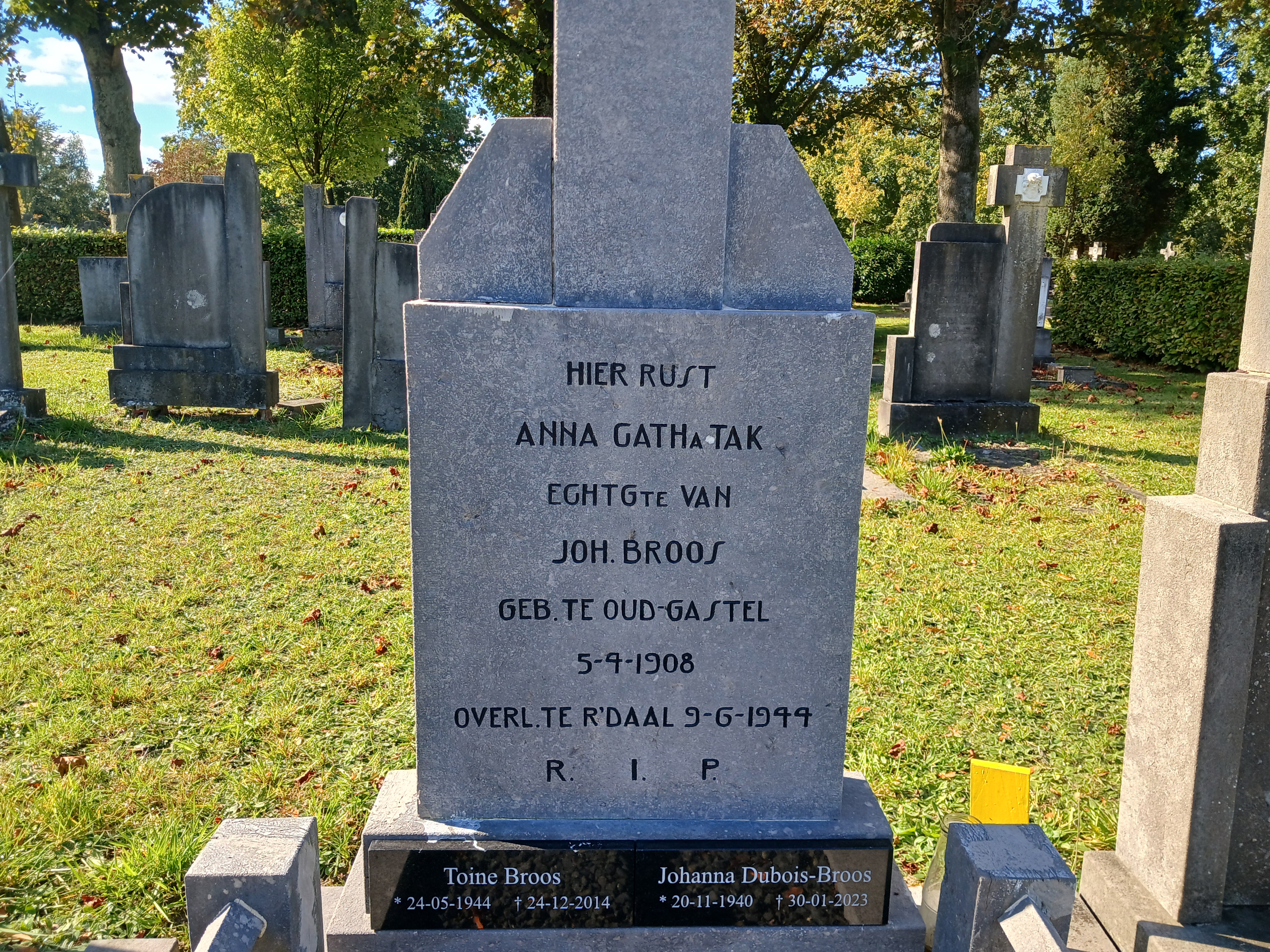 Mathijssen: “De RK begraafplaats is sinds 1 januari 1978 gesloten.” Op verzoek van de Zwitsers tak van de familie zijn echter de jongere broer en oudere zus van Broos nu bij hun moeder. “We hebben ruimte vrij gemaakte voor de urnen en zij hebben die zelf geplaatst. Wij mogen dat niet”, legt Mathijssen uit.