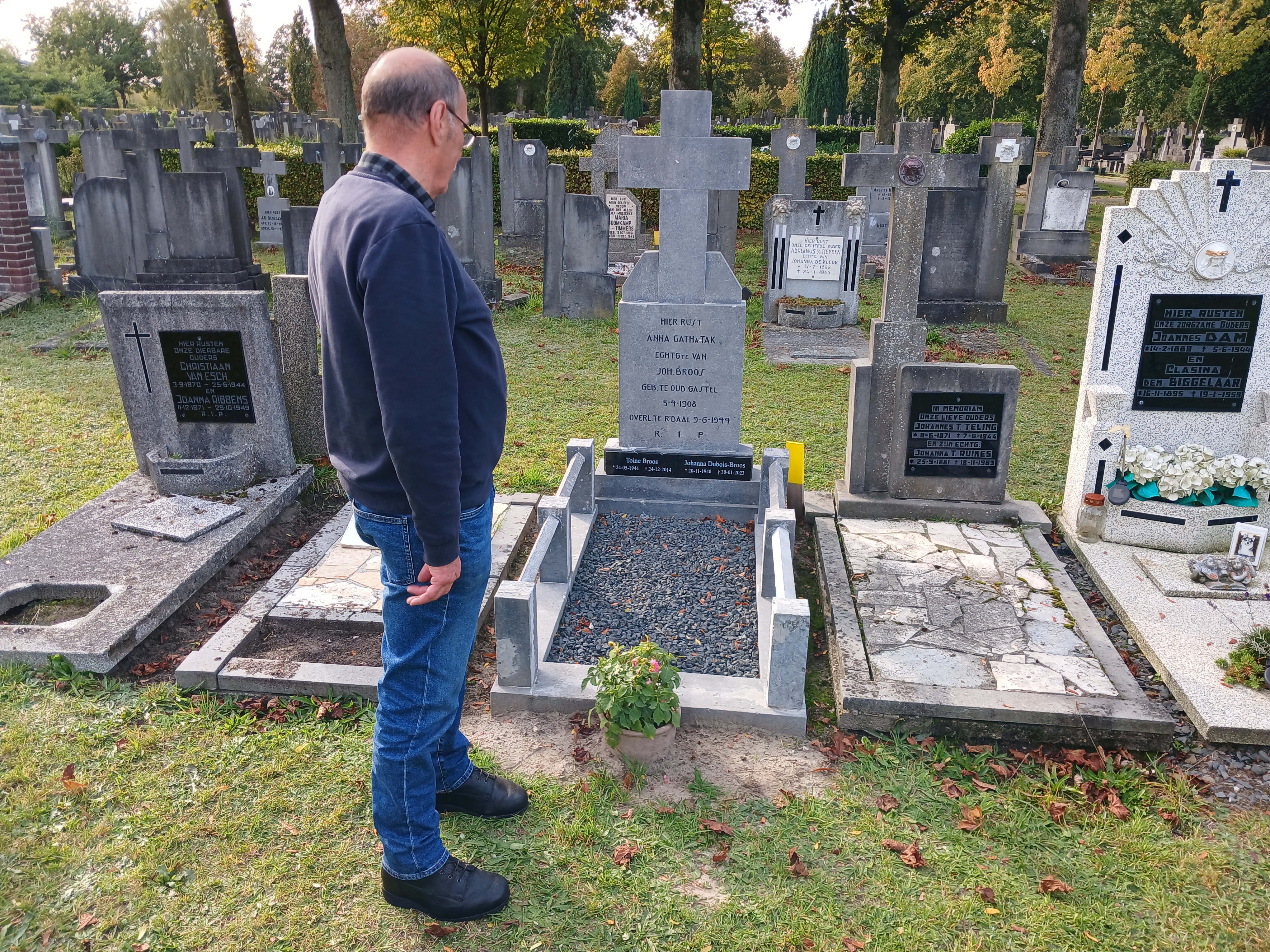 Jan Broos (bijna 82) leeft intussen langer in Haarlem dan hij ooit in Roosendaal is geweest. Toch was hij enorm blij -létterlijk- toen de Stichting Begraafplaatsen liet weten dat het graf van zijn moeder, overleden in de oorlog, was gevonden. Dat graf is door de vrijwilligers van de stichting gerestaureerd voordat Broos zelf kwam kijken.