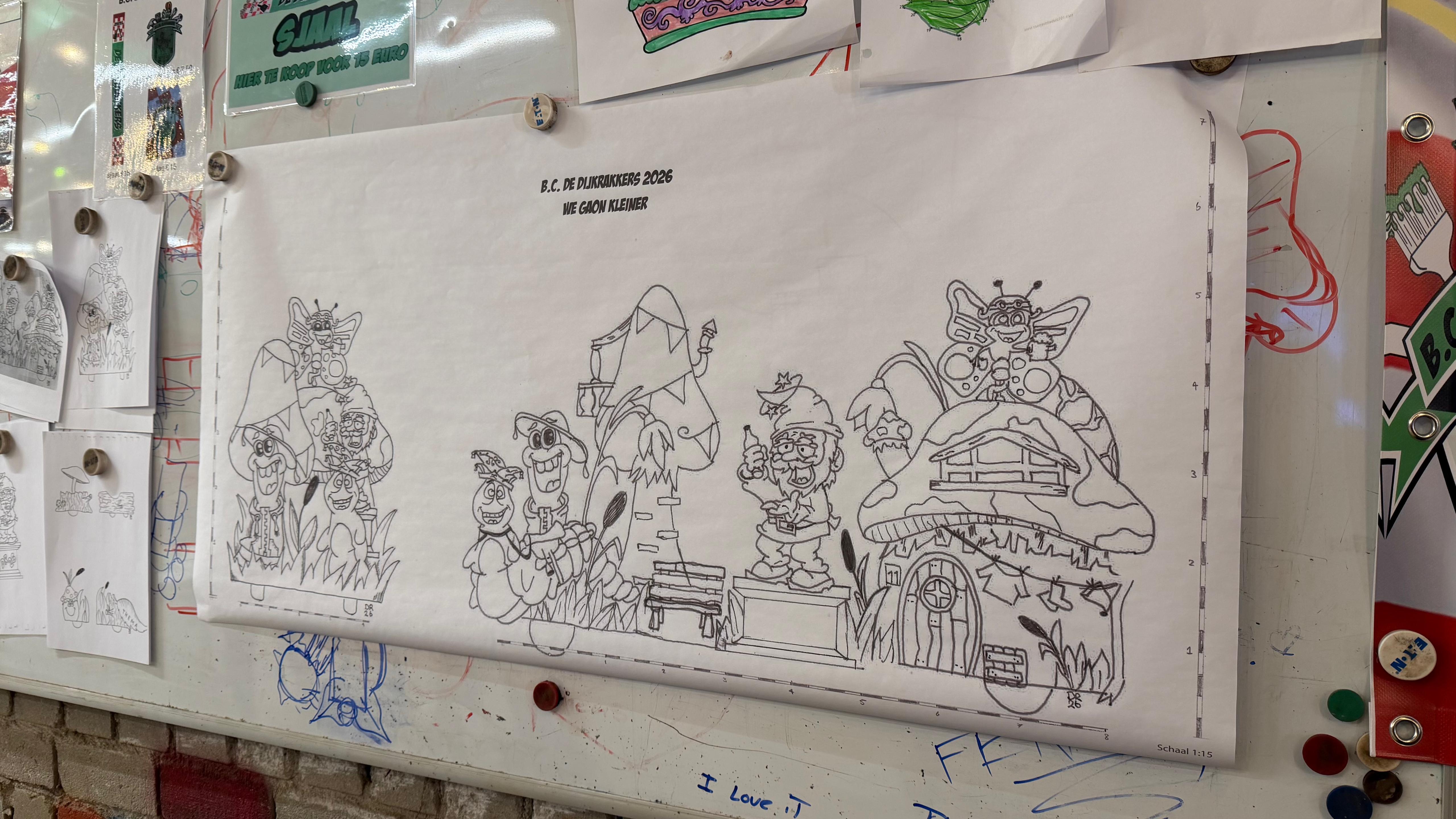 B.C. De Dijkrakkers bestaat sinds 2001. “We bouwen alles helemaal zelf.” Ieder jaar bouwt de club een grotere wagen. “Behalve dit jaar”, lacht Johan. Want het thema van de wagen is: We gaan kleiner. “Dus toen kwamen we op een kabouterthema uit.”