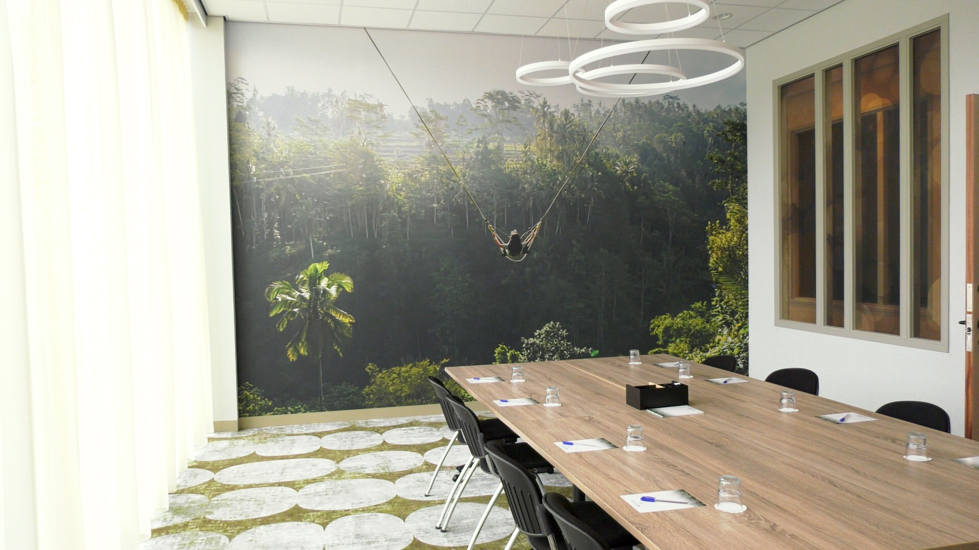 De wellness zelf wordt nog verbouwd. Net als de tuin waar meerdere sauna’s en zwembaden in te vinden zijn. Als laatste laat ze de vergaderruimtes zien. Deze hebben allemaal een ander thema. Ook is er een hele grote vergaderruimte. “In theateropstelling kun je hier 120 mensen kwijt.”
