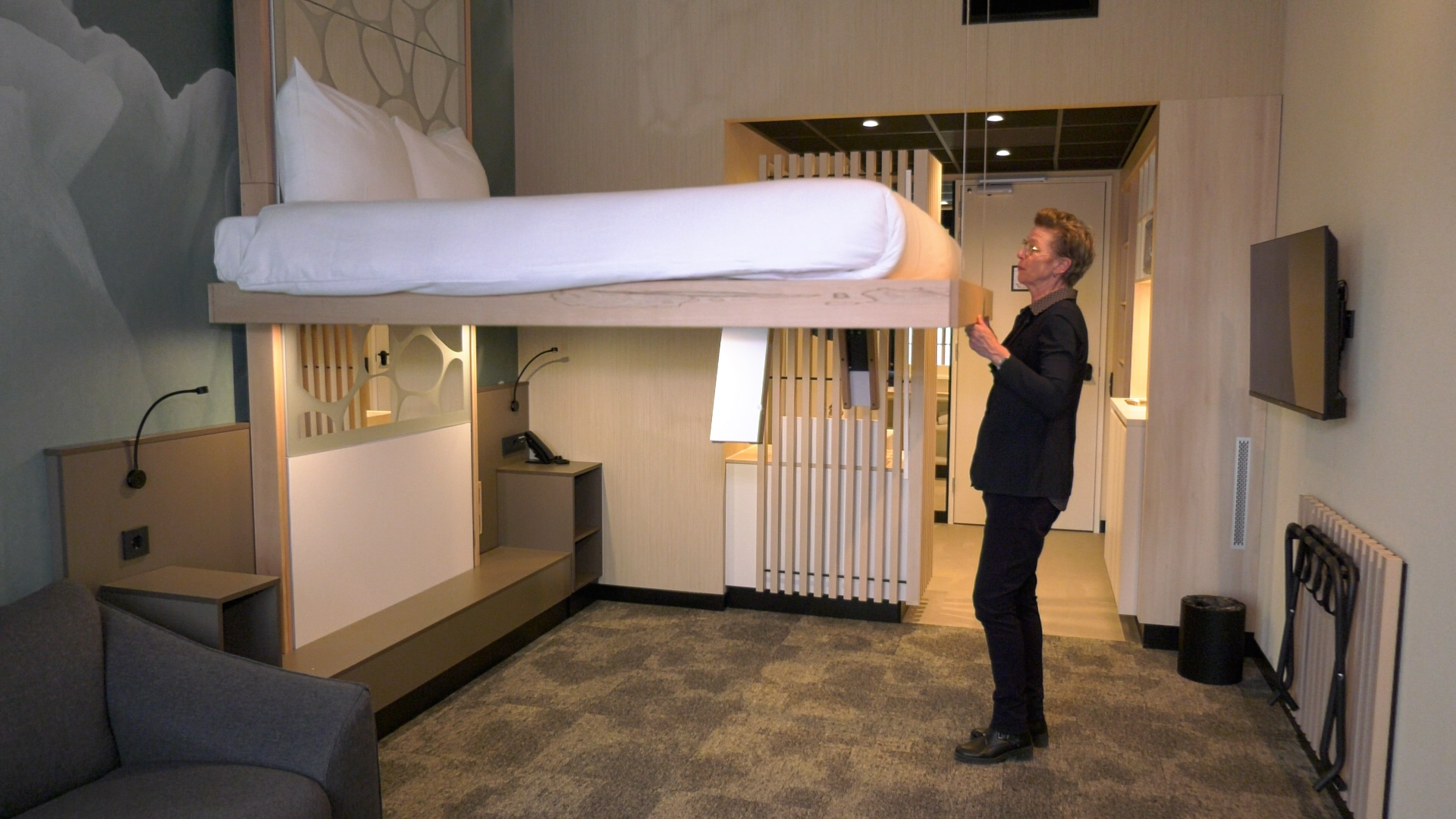 Boven laat de hotelmanager twee kamers zien. Bij sommige kamers kan het bed omhoog om meer werkruimte te creëren, ook zijn er kamers met een jacuzzi en een extra bed.