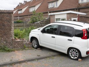 · De bestuurder van de witte Fiat Panda had door onbekende oorzaak een tuinmuur in Steenbergen omver gereden.
