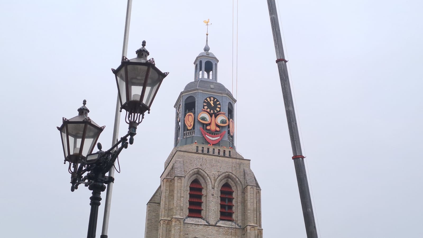 Foto’s en filmpjes van de Peperbus met een gezicht en een boerenkiel had ze al gezien. Maar vrijdagochtend kon burgemeester Margo Mulder met eigen ogen zien hoe de kerktoren werd voorzien van zijn Vastenavend-outfit. En daar komt nog een boel bij kijken, merkte ze.