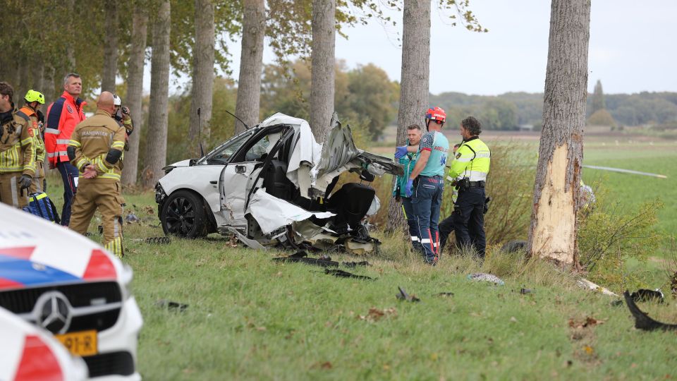 Door de klap is ook de auto flink beschadigd geraakt. Daarbij zijn stukken van de auto tientallen meters verderop beland in een weiland en op een naastgelegen weg. De politie doet nog onderzoek en daardoor is de weg afgesloten.