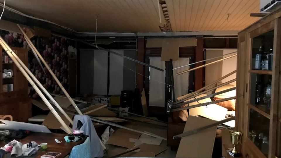 ,,Mijn dochter is vervolgens naar de deur gespurt, maar het kind kreeg de deur niet meer open omdat het plafond al zover was ingezakt. Ik heb hier in het midden van de kamer de plafondplaten rondgedanst. Mijn vrouw heb ik naar buitengestuurd, niet veel later viel de afzuigkap ook naar beneden middenin de kookplaat, terwijl de aardappelen nog aan het koken waren. Het had dus vervelender kunnen aflopen.”