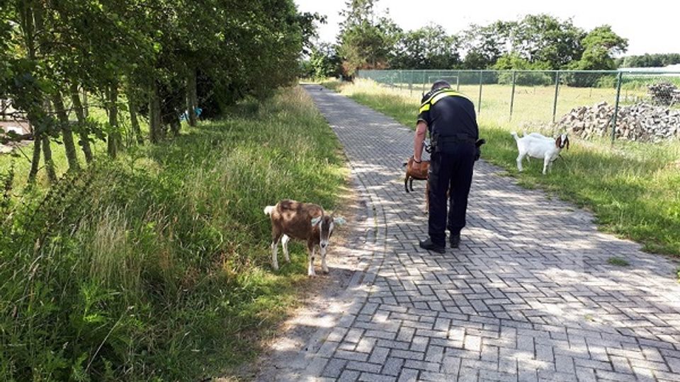 De politie werd gewaarschuwd door een oplettende wielrenner. Niet alleen de wielrenner, maar ook het verkeer ondervond hinder door de loslopende dieren. Met behulp van de eigenaar hebben de agenten de geiten terug in hun verblijf gekregen.