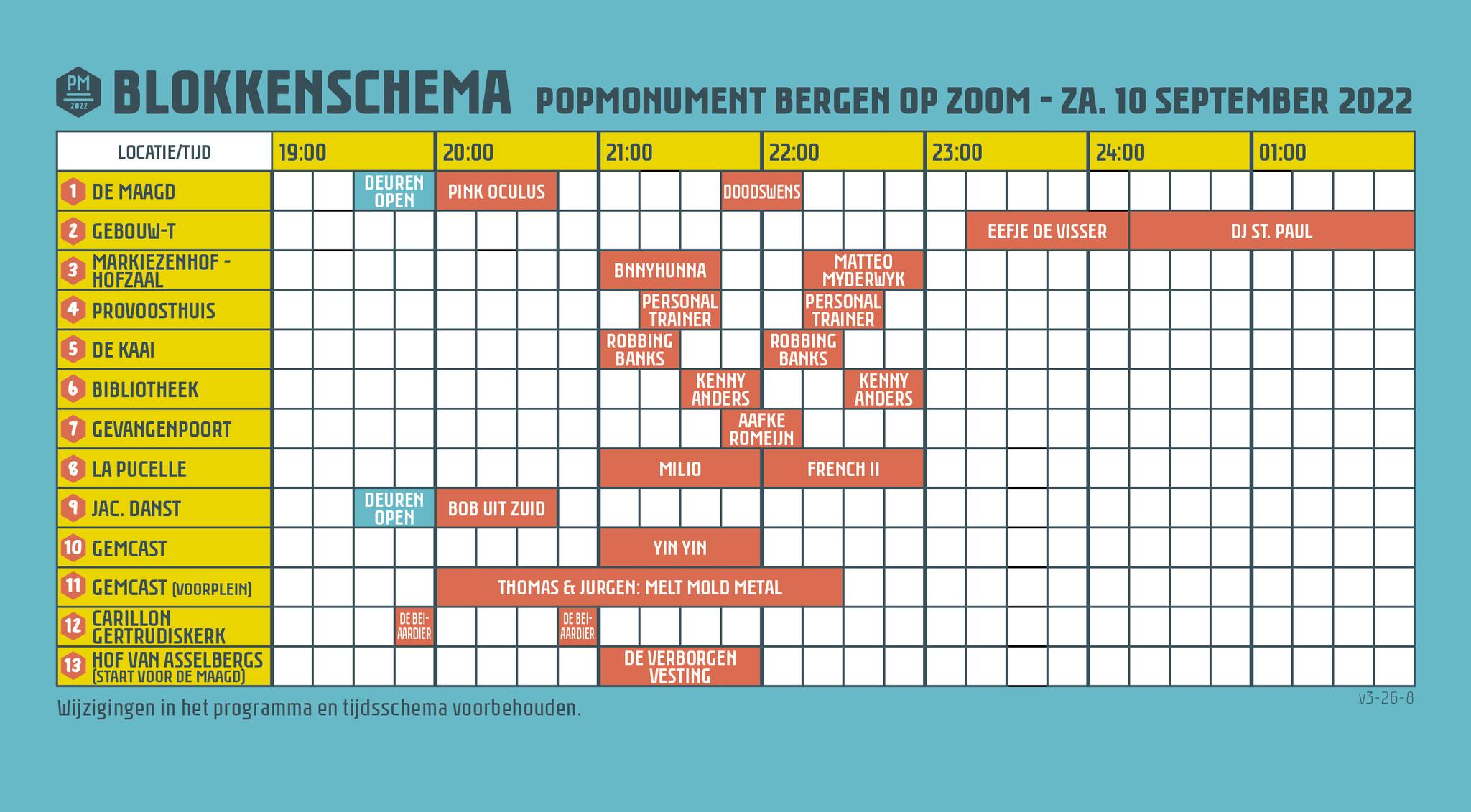 PopMonument is op zaterdag 10 september en de eerste optredens beginnen om 19.30 uur. Een toegangskaart kost 35 euro en daarmee kun je op alle locaties naar binnen. Het complete programma kun je vinden op PopMonument. Daar kun je ook online kaarten bestellen. Of je kunt ze in Bergen op Zoom kopen bij de VVV Brabantse Wal en poppodium Gebouw-T.