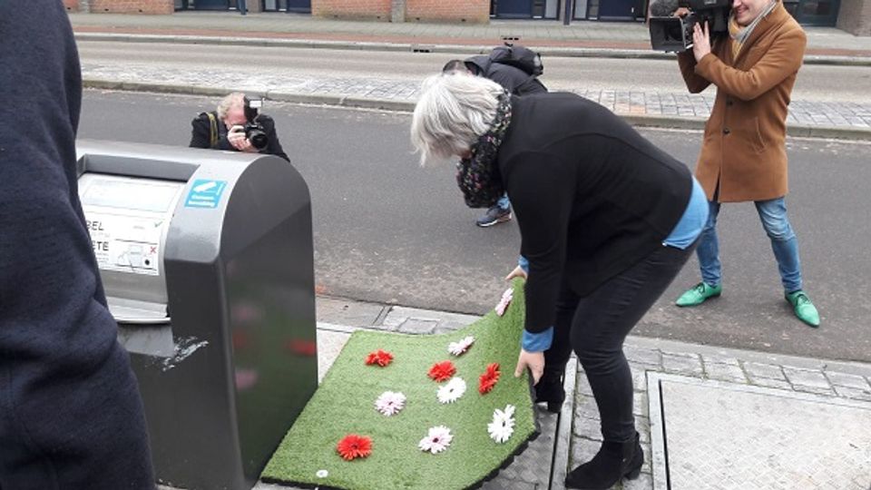 Proef met kunstgrasmatten met bloemen bij ondergrondse containers