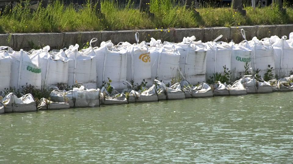De verzwakte Bergse kademuren zijn met zandzakken versterkt. (foto: ZuidWest Update)