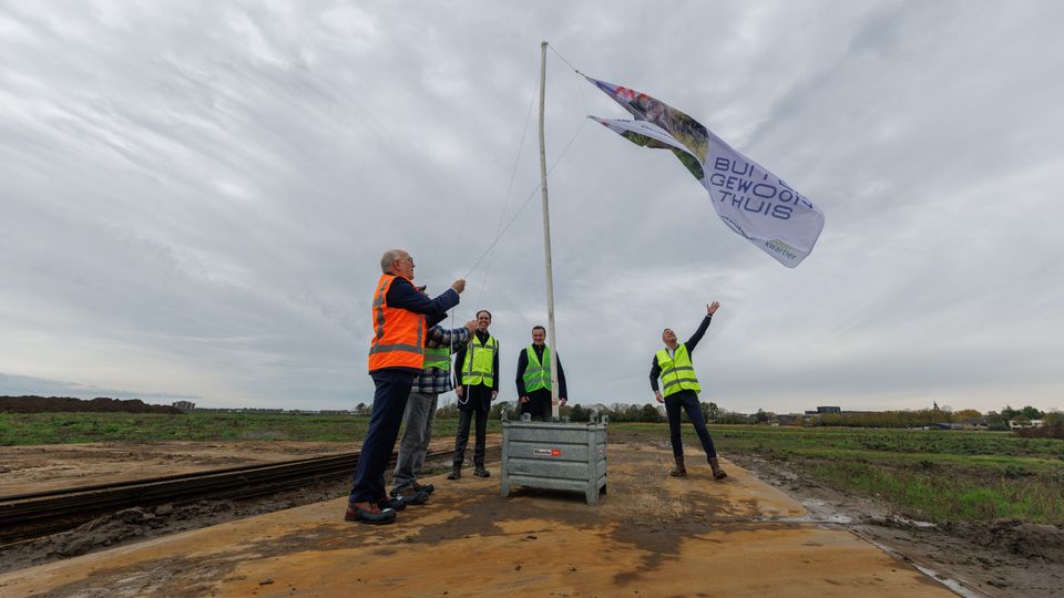Midden op het terrein waar straks woningen staan werd door de verschillende partijen een vlag gehesen. Ook wethouder Eef Schoneveld van Moerdijk was aanwezig. Met deze handeling zetten de partijen de samenwerking kracht bij.