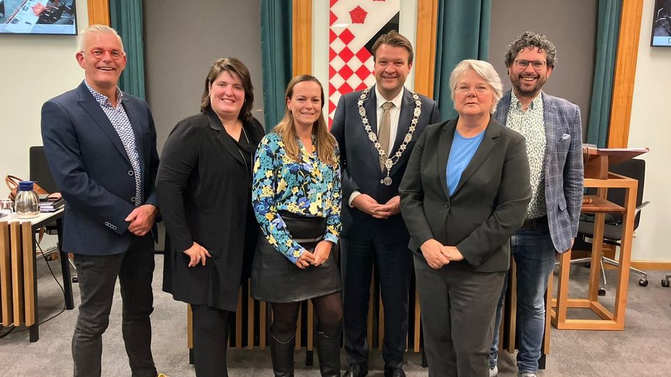 Het college van burgemeester en wethouders van de gemeente Roosendaal (van links naar rechts: René van Ginderen, Sanneke Vermeulen, Evelien van der Star, Han van Midden, Klaar Koenraad en Arwen van Gestel) | Foto: Gemeente Roosendaal