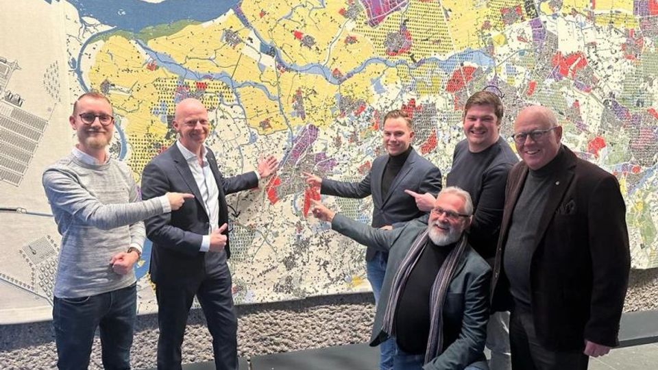 Een aantal fractieleden en raadsleden wijzen Roosendaal aan op de kaart in het Provinciehuis. Foto: gemeenteraad Roosendaal