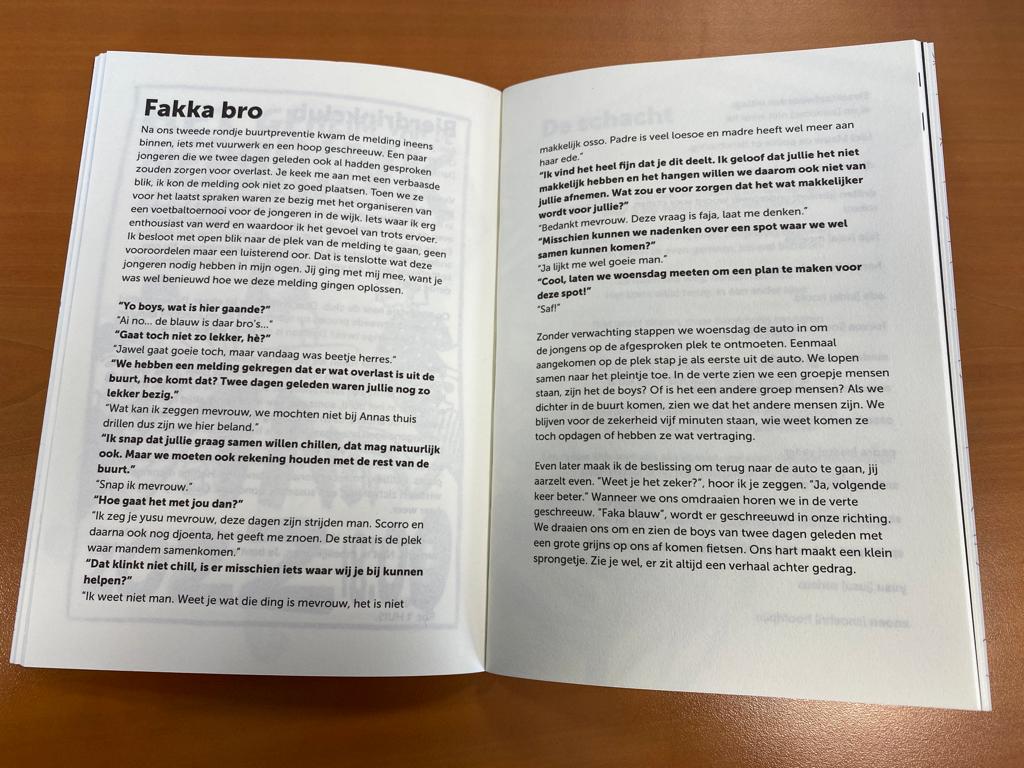 Naast het verhaal Handdoekje leggen, staat er onder andere het buurtpreventieverhaal Fakka bro – inclusief straattaalwoordenuitleg, een recept voor een goede eindejaarsborrel, en een test in het boek. Daarmee ontdek je of je een kletskop, mariakaakje, Oreo, Sultana of Liga bent. ‘Als Roosendaal een koektrommel zou zijn, zouden er vele smaken te vinden zijn.’