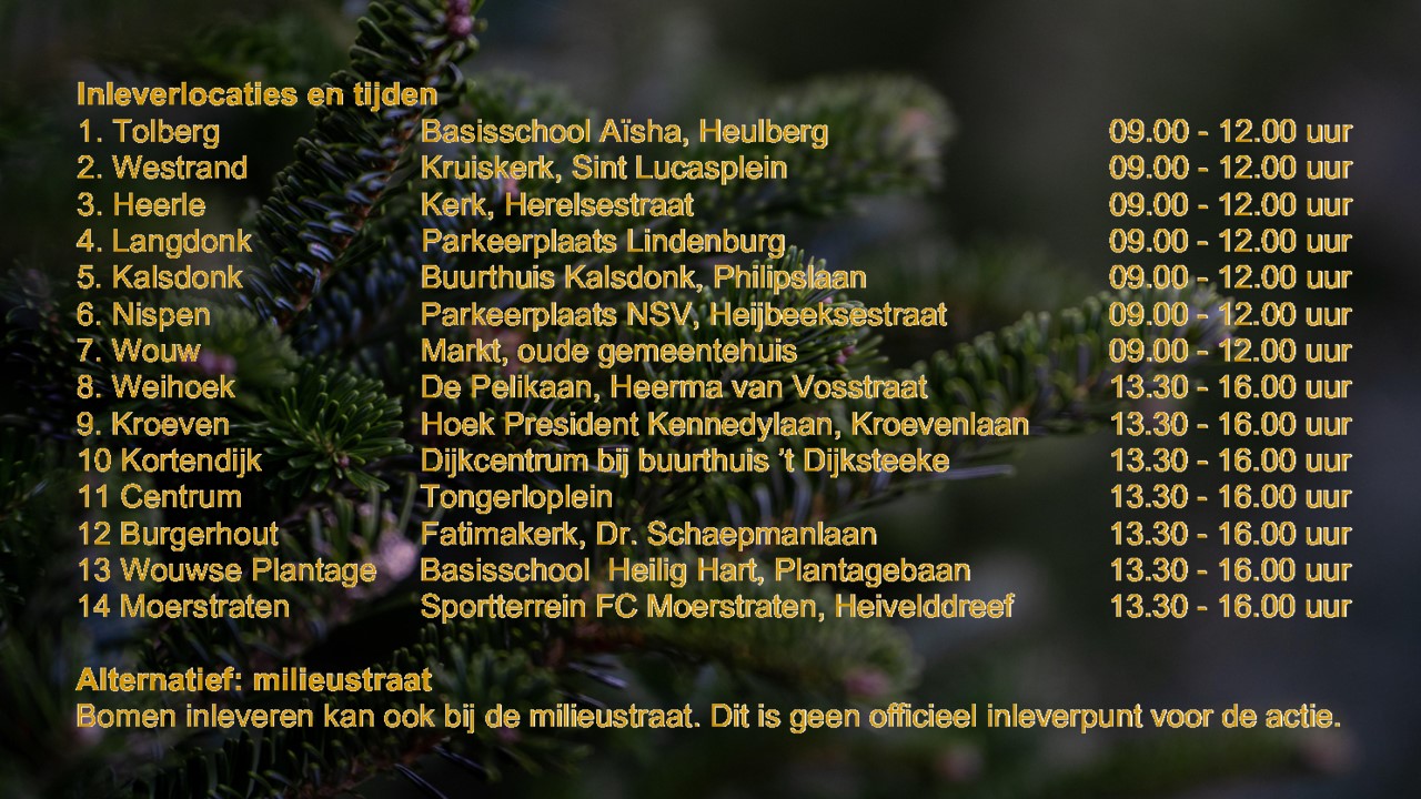 Breng je kerstboom (zonder pot of plastic zak) op zaterdag 11 januari 2025 naar één van de veertien inzamellocaties in Roosendaal. Voor elke ingeleverde boom ontvang je een knipje op een speciale knipkaart. Hoe meer bomen je inlevert, hoe meer knipjes je verzamelt en hoe groter de kans op een prijs!