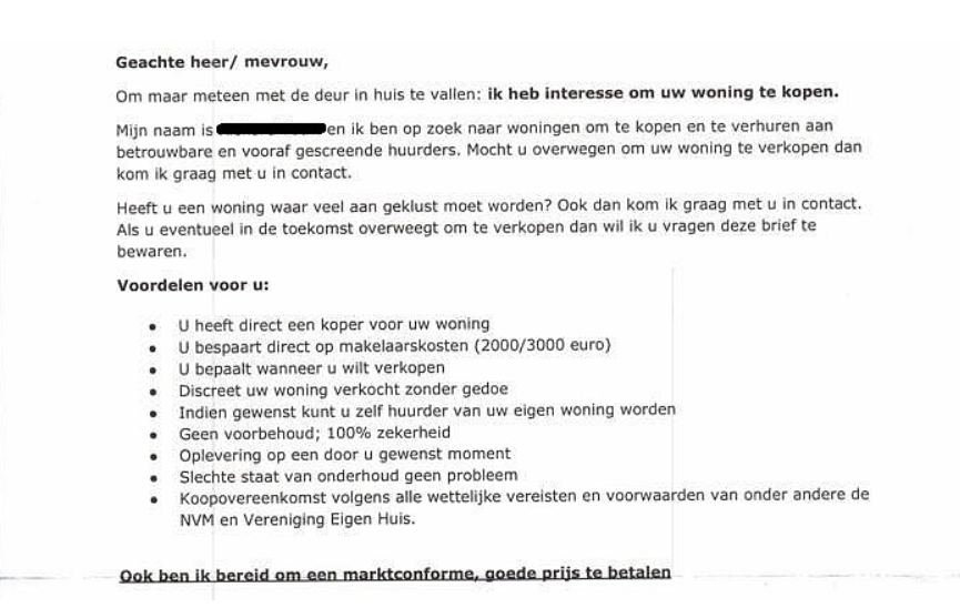 Maar waar dat soort verzoekjes nog wel op sympathie of zelfs medelijden kunnen rekenen, is dat bij de andere categorie vaak anders. “Meer en meer mensen zien huizen als een goede belegging. Vaak komen die investeerders daar ook open voor uit. En ze benadrukken de voordelen, zoals het overslaan van de makelaarskosten.” Toch levert het volgens Grosfeld ook maar zelden iets op. “Dit is echt maar voor een enkeling interessant. Waar bemoei je je mee, zullen de meeste mensen denken. Ik bepaal zelf wel wanneer en aan wie ik mijn huis verkoop.”