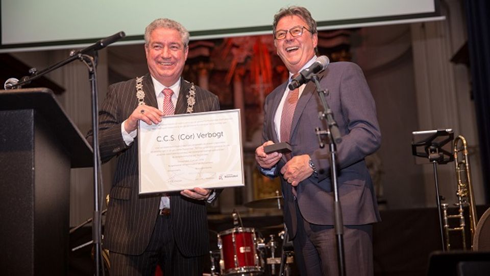 Burgemeester Jacques Niederer heeft dinsdagavond tijdens de traditionele Nieuwjaarsreceptie in de Sint Jan een Roosenspeld uitgereikt aan Cor Verbogt.