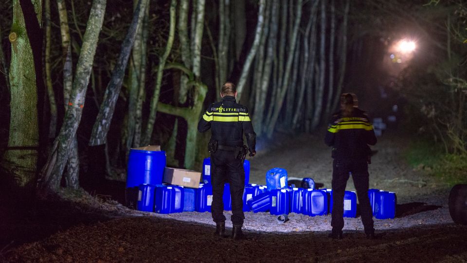 De ontdekking werd rond half twaalf ’s nachts gemeld bij de hulpdiensten. De brandweer heeft metingen verricht en de omgeving is afgesloten. Het gaat in totaal om 112 jerrycans en twee olievaten, die waarschijnlijk afkomstig zijn van een drugslab. Onderzoek van de politie moet dat nog wel officieel uitwijzen.