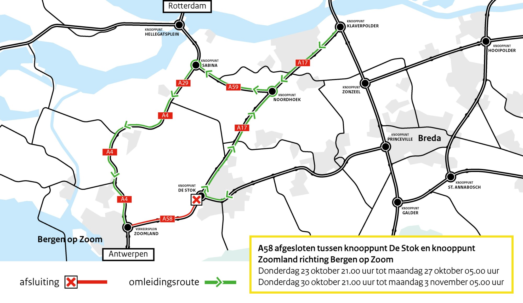 De werkzaamheden starten op donderdag 23 oktober om 21.00 uur en duren tot maandag 27 oktober 05.00 uur. Ook het daaropvolgende weekend zal de A58 afgesloten zijn. Van donderdag 30 oktober 21.00 uur tot maandag 3 november 05.00 uur voert Rijkswaterstaat ook onderhoud uit op de A58 tussen De Stok en Zoomland.
