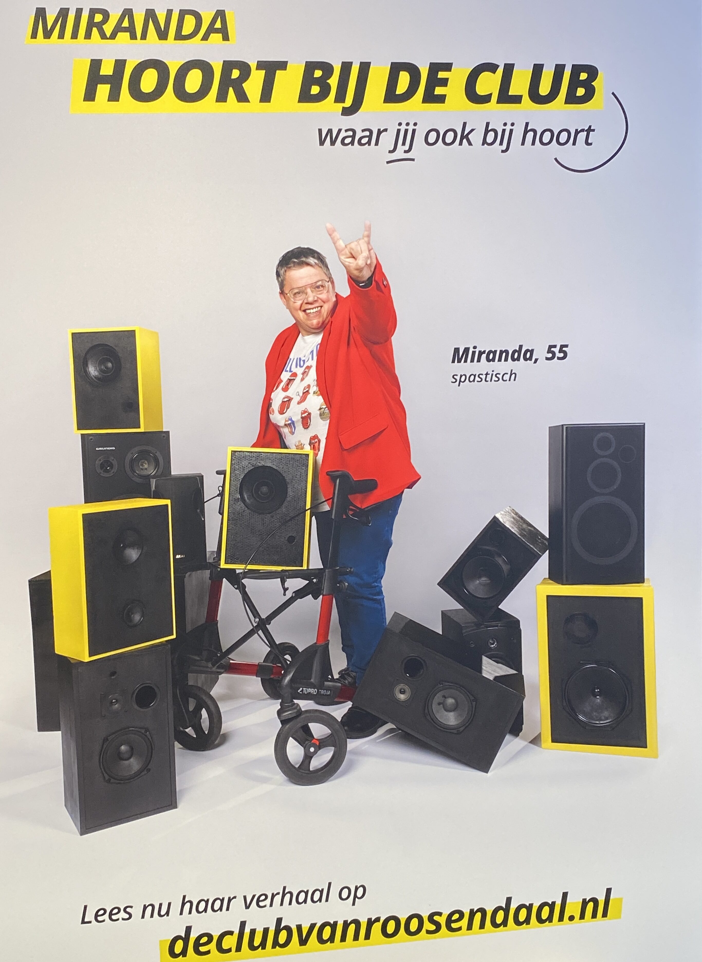 Miranda Oomen (55) uit Wouwse Plantage werd twaalf weken te vroeg geboren, met zuurstofgebrek. Hierdoor liep ze hersenletsel op. Inmiddels is ze spastisch vanaf haar heupen en loopt ze met een rollator. Ze krijgt daardoor vaak te maken met vooroordelen. “Ik heb het gevoel me steeds te moeten bewijzen.” Nu is ze uitgeroepen tot één van de zes ambassadeurs van de club van Roosendaal. Deze campagne moet bijdragen aan meer bewustzijn over inclusie.